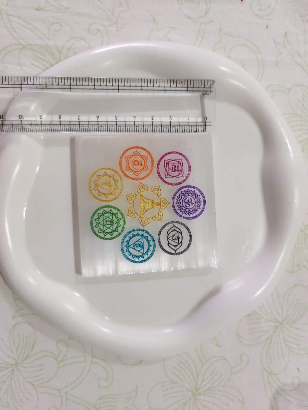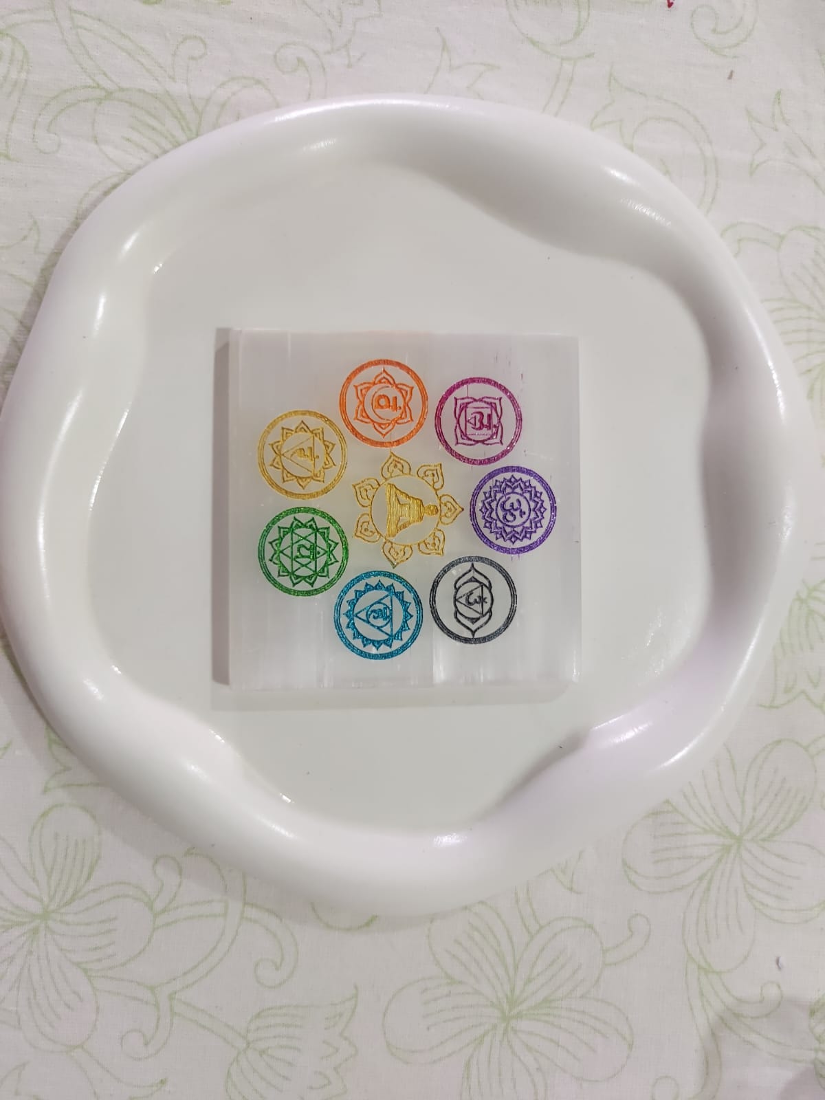 This 7 Chakra Selenite Plate is a stunning spiritual tool to anchor your intentions, align your energies, and bring balance to your everyday life.